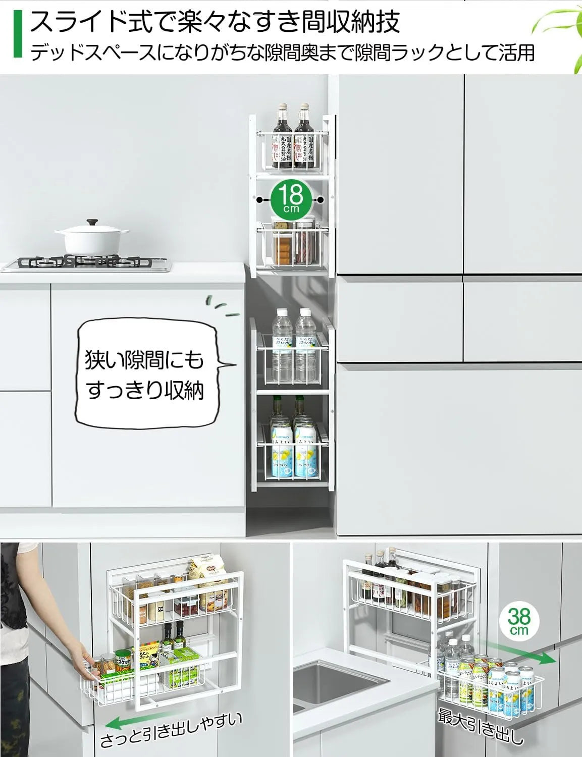 - 安心できるデザイン:抜け落ち防止ストッパー付きで、引き出し方向が簡単に変更可能。付属のストッパー(ボルト)を外すだけで、左右どちらからでも引き出せます。冷蔵庫や洗濯機の横など、設置面の向きを選びません。