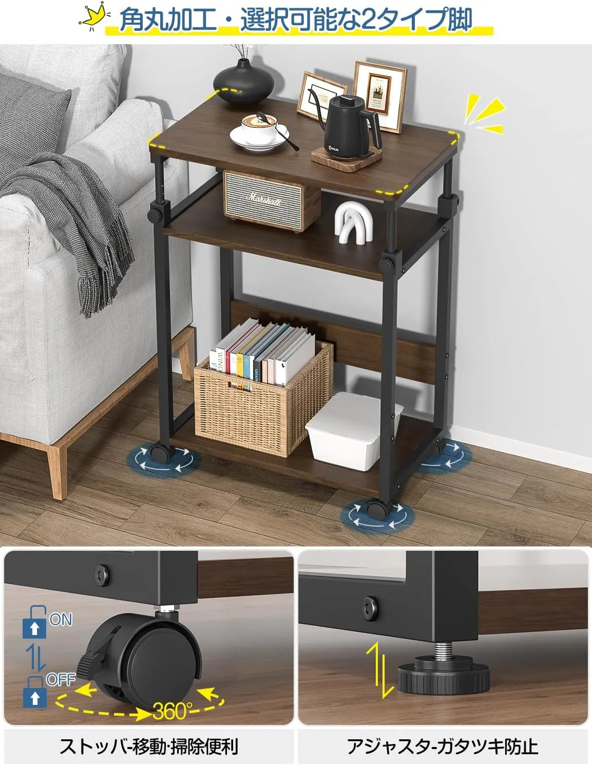 このパソコンワゴンの天板は、高さを67cm〜95cm(アジャスター使用時、キャスター装着時は71〜95cm)の間で自由に調節できます。4箇所のハンドルを手で回すだけで簡単に調整可能で、高さ調節用つまみは組み立て時に四方向へ配置できるため、デスク下に収納しても邪魔になりません。昇降可能な天板はサイドデスクとしても活用でき、作業スペースを拡張して効率を高めます。
