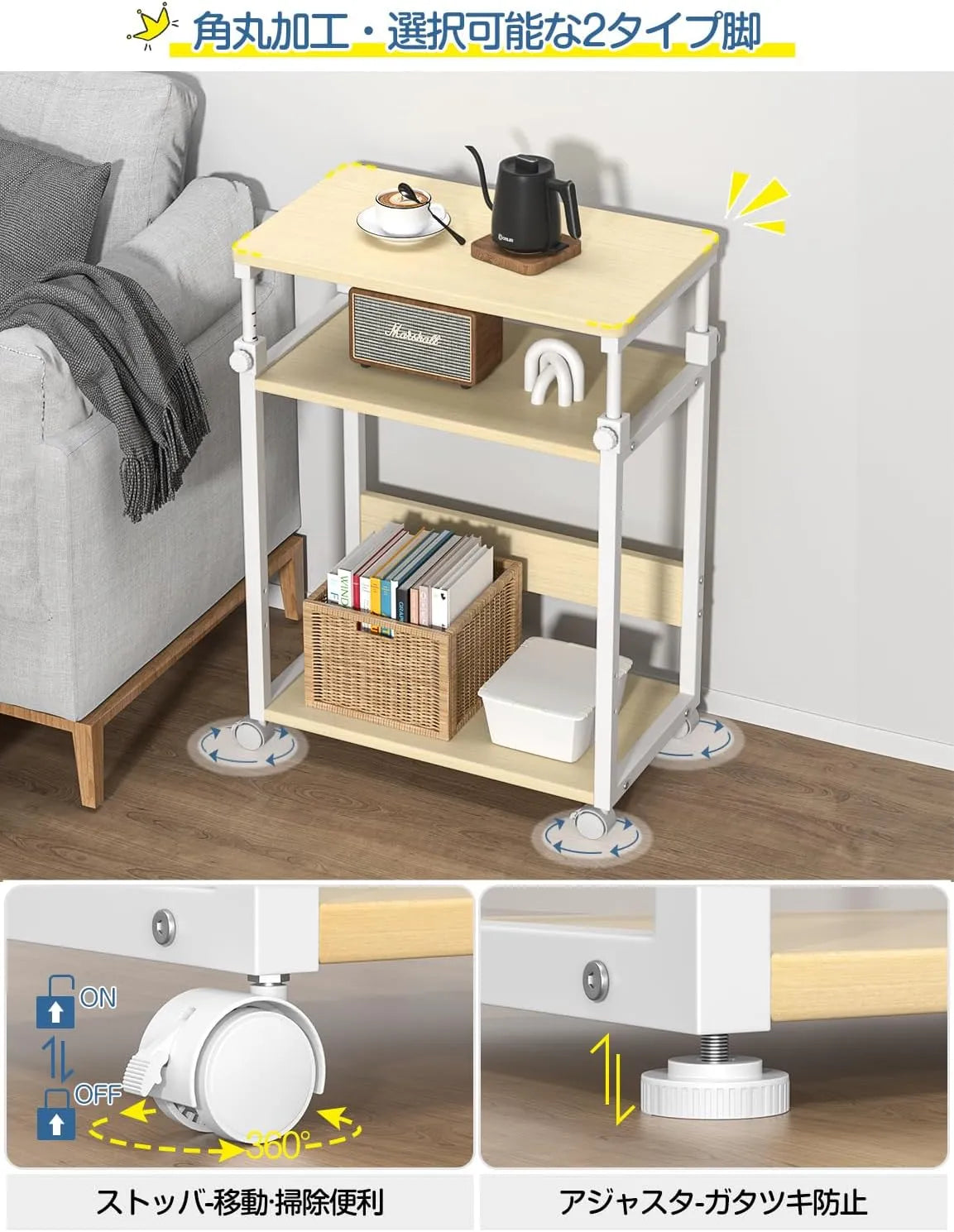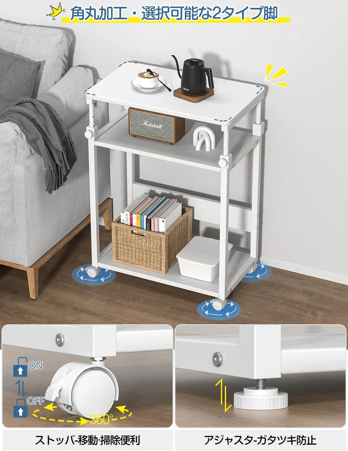 脚部には360°回転キャスターを装備。移動が楽で掃除や配置換えにも便利です。キャスターにはストッパー付きで、必要な時は安定して固定可能。さらにがたつき防止用アジャスターも4つ付属し、床の状態に応じて使い分けられます。