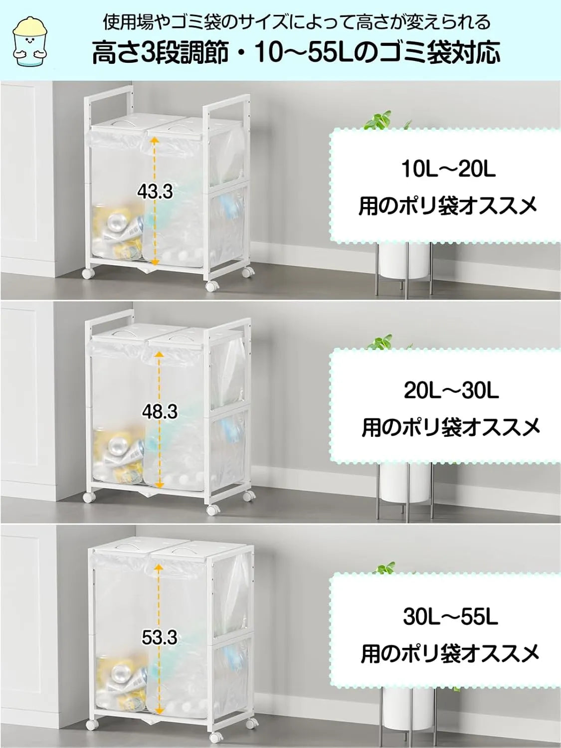 5cmピッチの3段階高さ調節が可能なため、ゴミ袋のサイズや設置スペースに合わせてぴったり合わせられます。10L〜55Lまでの幅広いサイズのポリ袋・レジ袋に対応。外枠がない設計により、袋の容量いっぱいまでゴミを詰め込め、汚れやニオイが付着する心配もなく洗う手間も不要です。