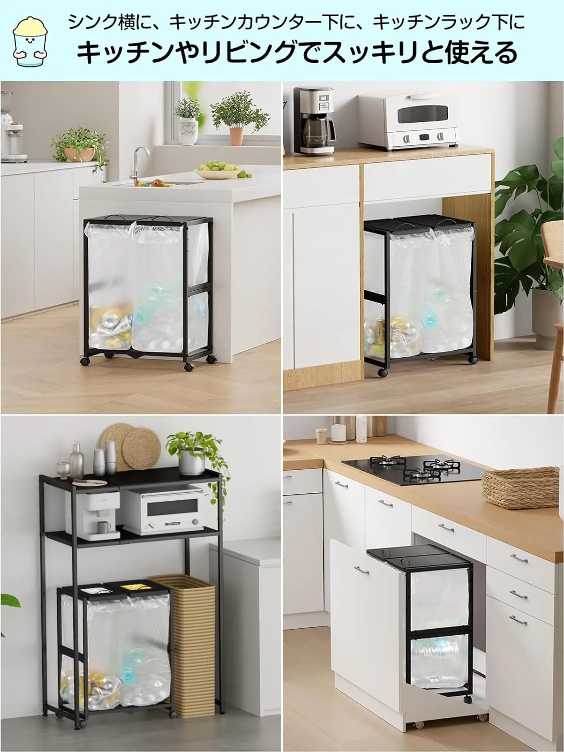 1台で2つのゴミ袋を同時設置でき、空き缶・びん・ペットボトル・プラスチックなど、素材別にゴミを分けて捨てられる便利なスタンドです。
