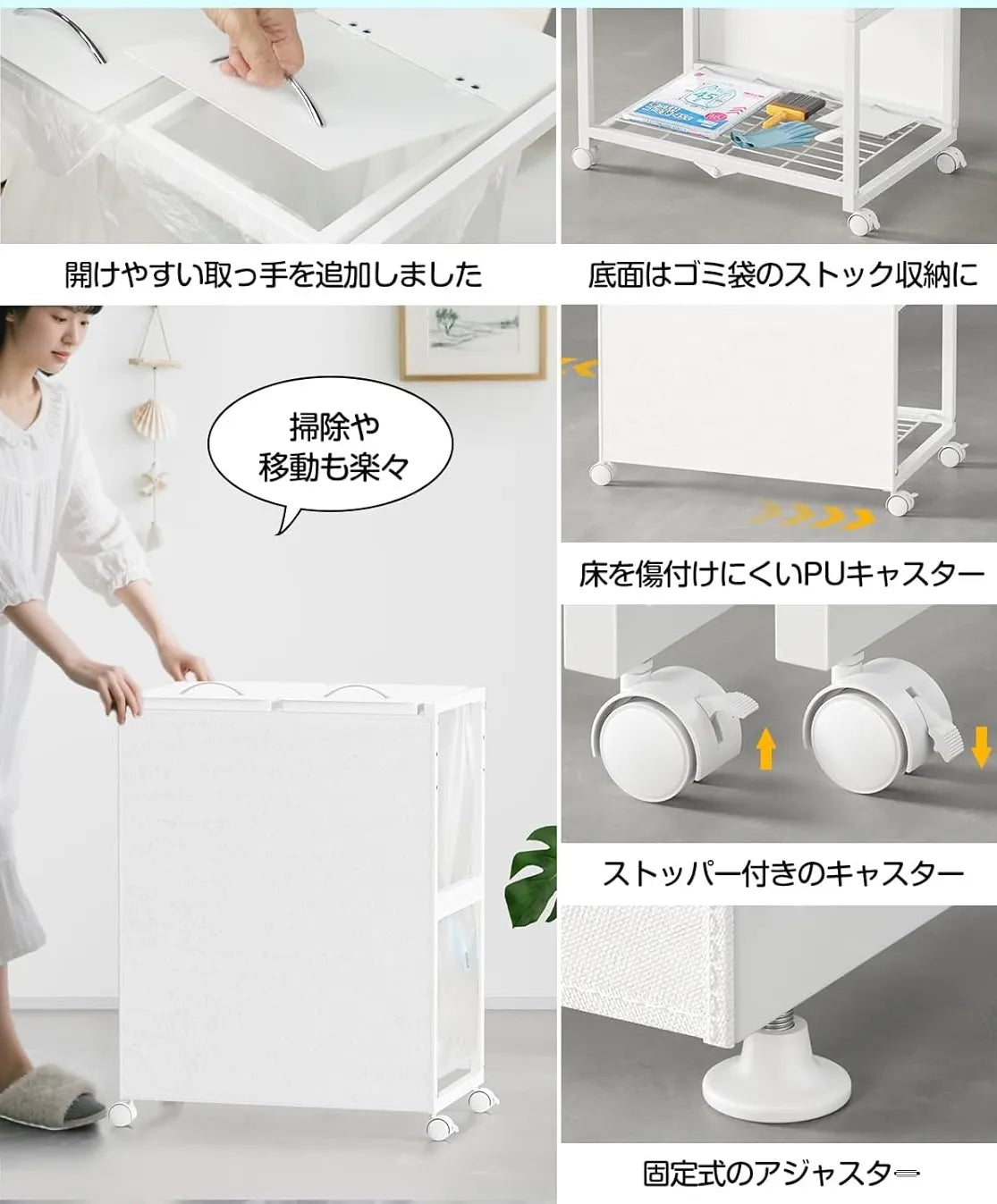 アジャスターでガタツキを調整可能。床を傷つけにくいPUキャスターも付属し、ゴミ袋の交換や掃除時の移動がスムーズ(ストッパー機能付き)。頻繁に移動させる場合はキャスターの取り付けがおすすめです。