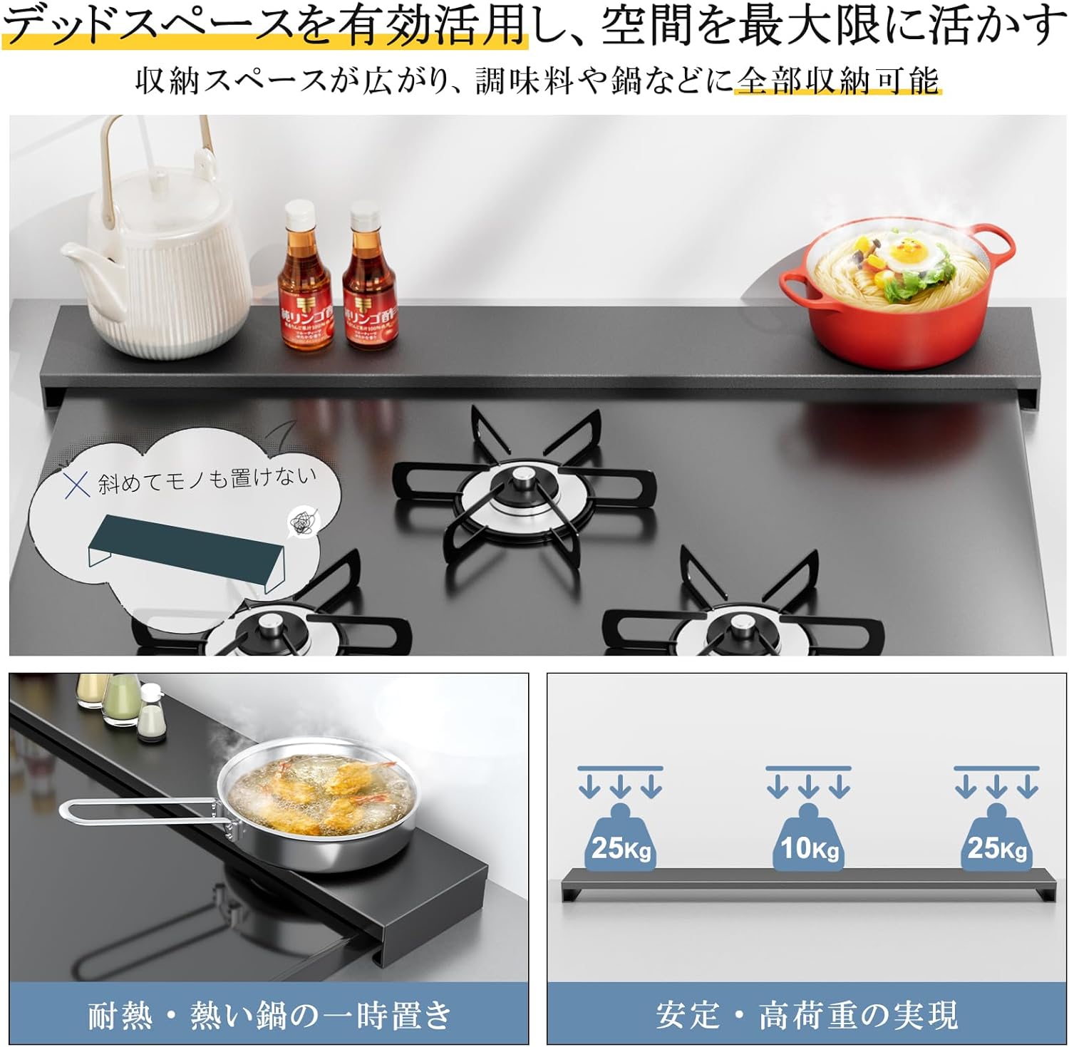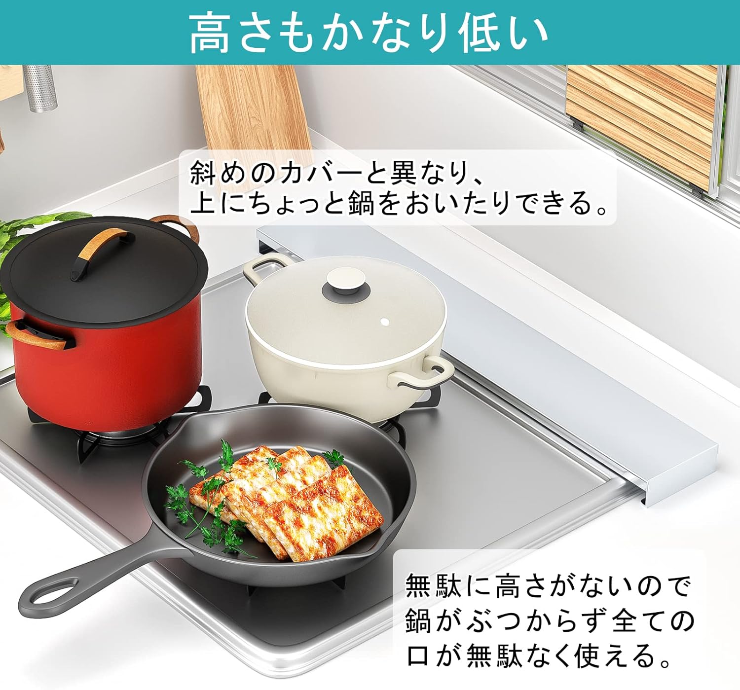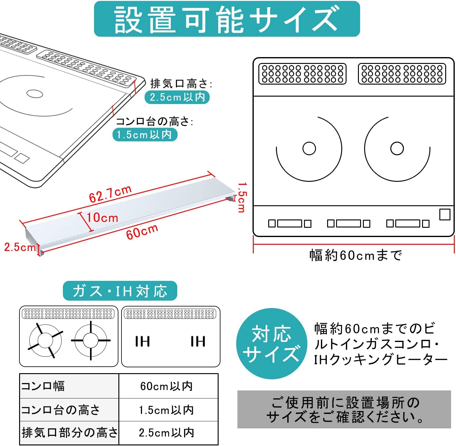 60cm幅のフラット設計で、IHコンロとガスコンロの両方に対応。さっと置くだけで設置完了、組み立てする必要がありません。