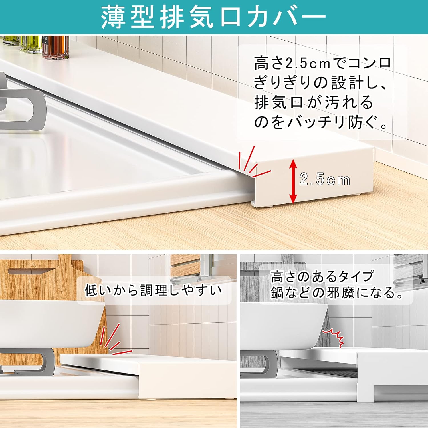この薄型の排気口カバーは、料理中の食材の落下や油はねによる汚れをしっかりガードし、排気口を汚れから守ります。