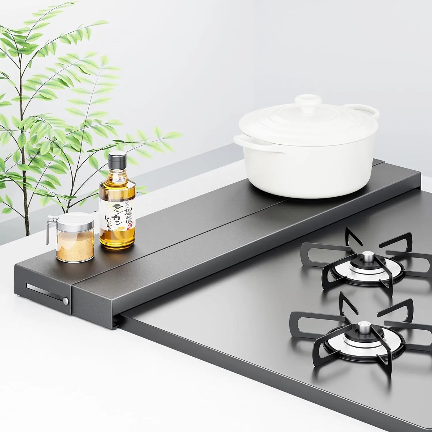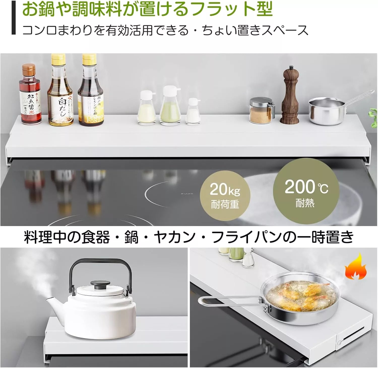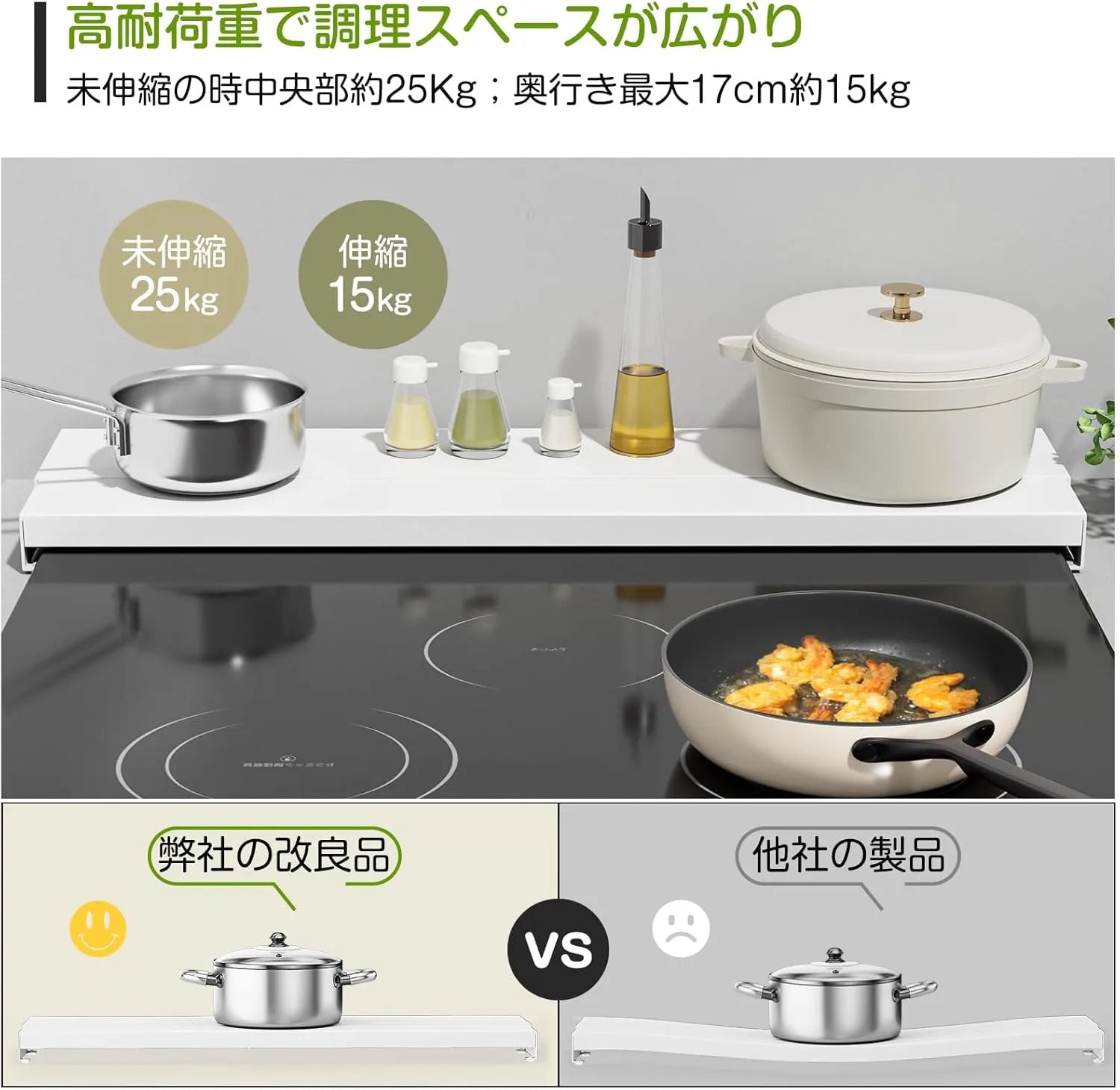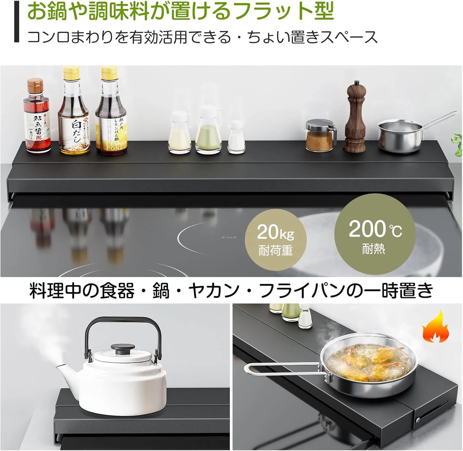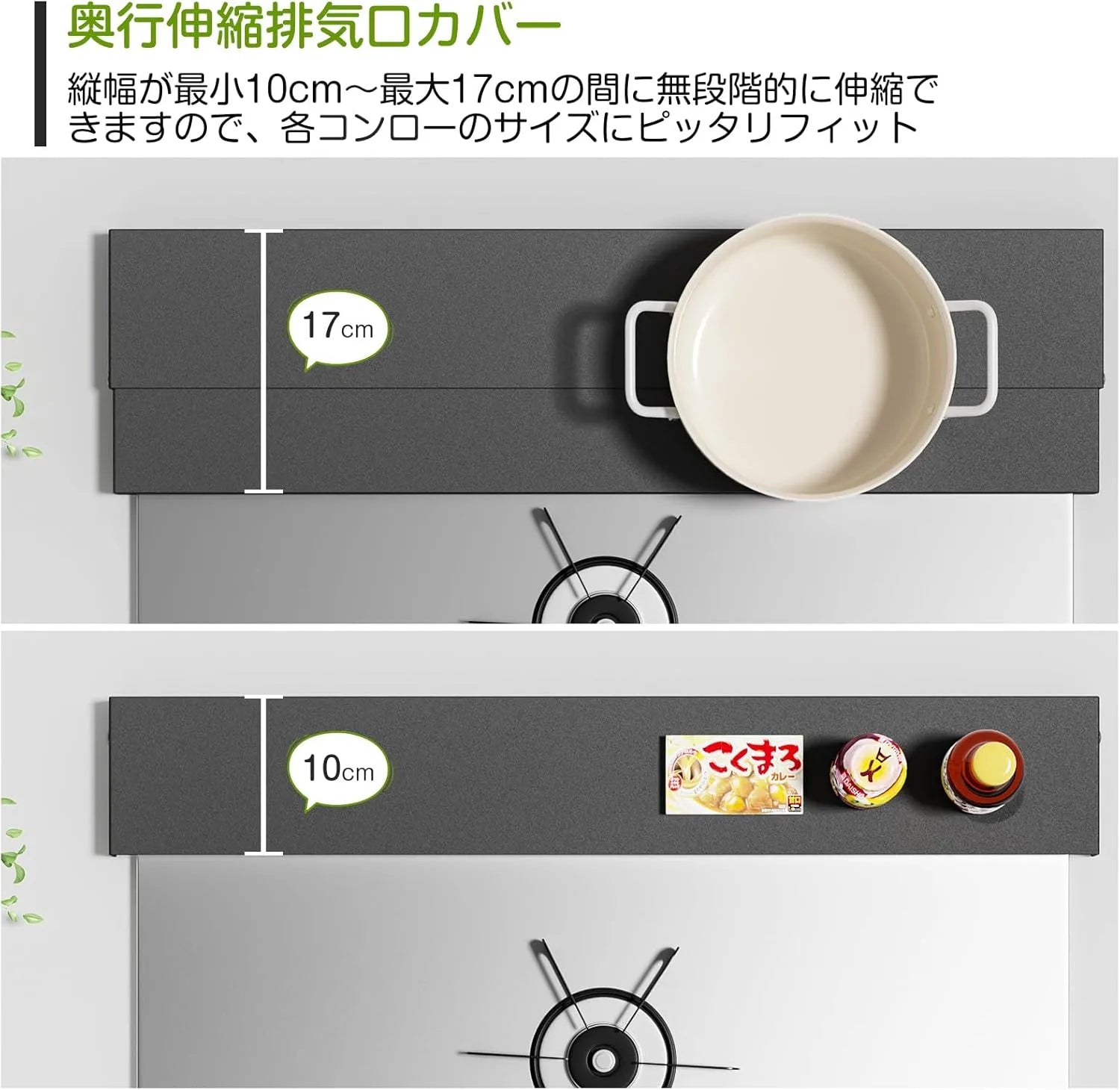【奥行伸縮10~17cm】横幅約63.5×奥行10~17×高さ3.7cmで、幅60cmまでのIH・ガスコンロに対応。