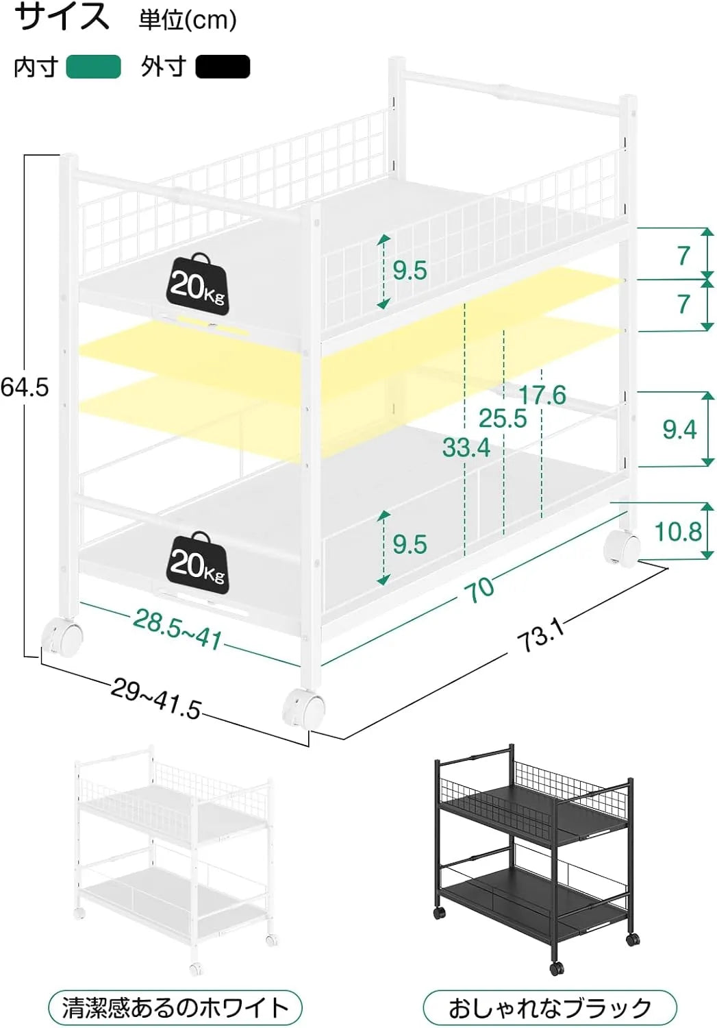横幅は約 29~41.5cm を無段階調整可能で、収納物や押し入れの大きさによって調整できる。幅を広くして大きな日用品の収納に最適です。