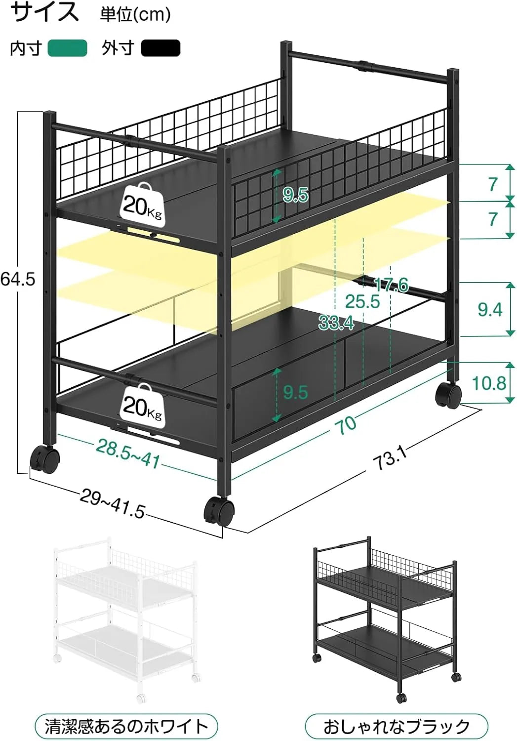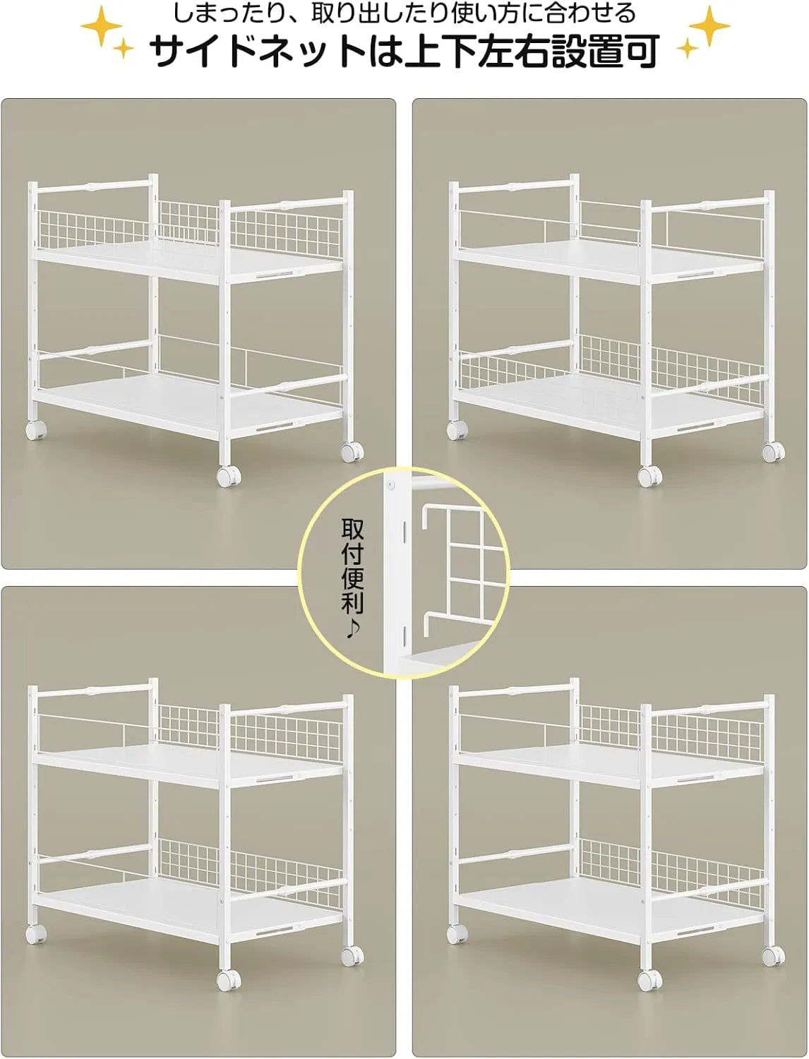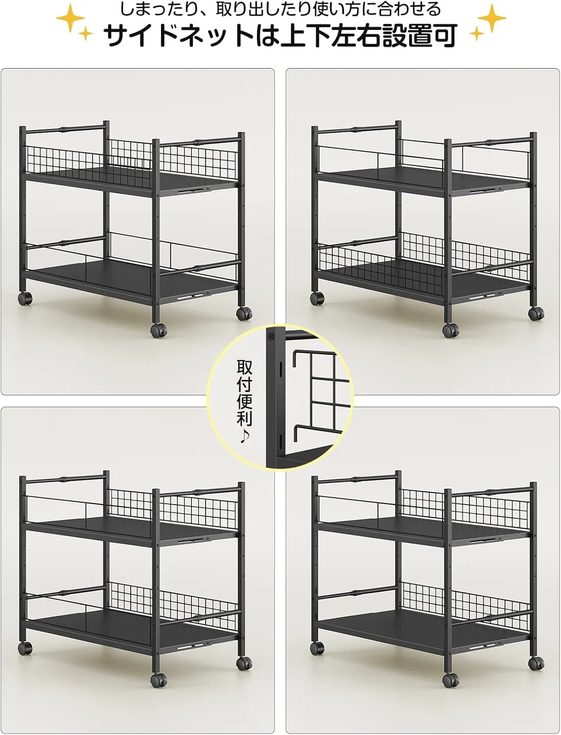 4つの可動メッシュネットは全て着脱可能(高さ約9.5cm)。落下防止用のサイドメッシュは、設置場所や利き手に合わせて左右どちらにも取り付けられます。大きなメッシュ設計で収納物がひと目でわかり、カゴ形状で物を入れてもこぼれにくい、実用性の高い収納ラックです。