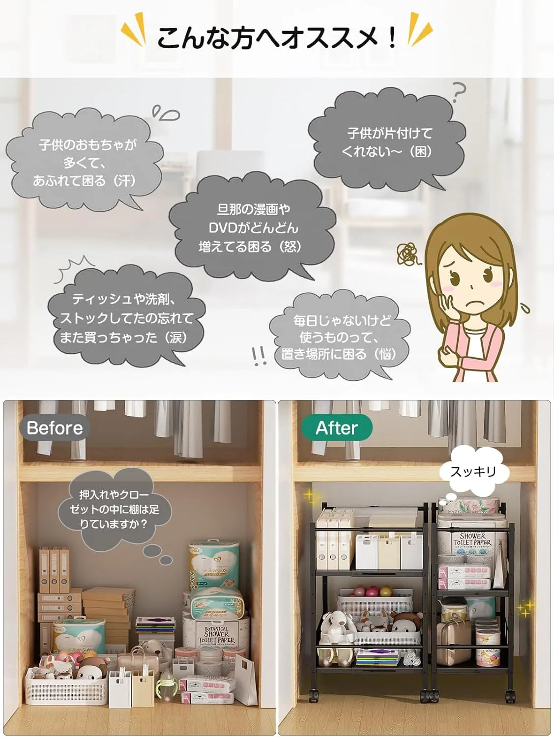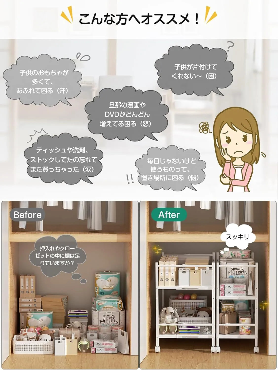 ・日用品収納:ティッシュ、シャンプー、洗剤などの買い置きを収納し、必要な時にすぐ取り出せます。