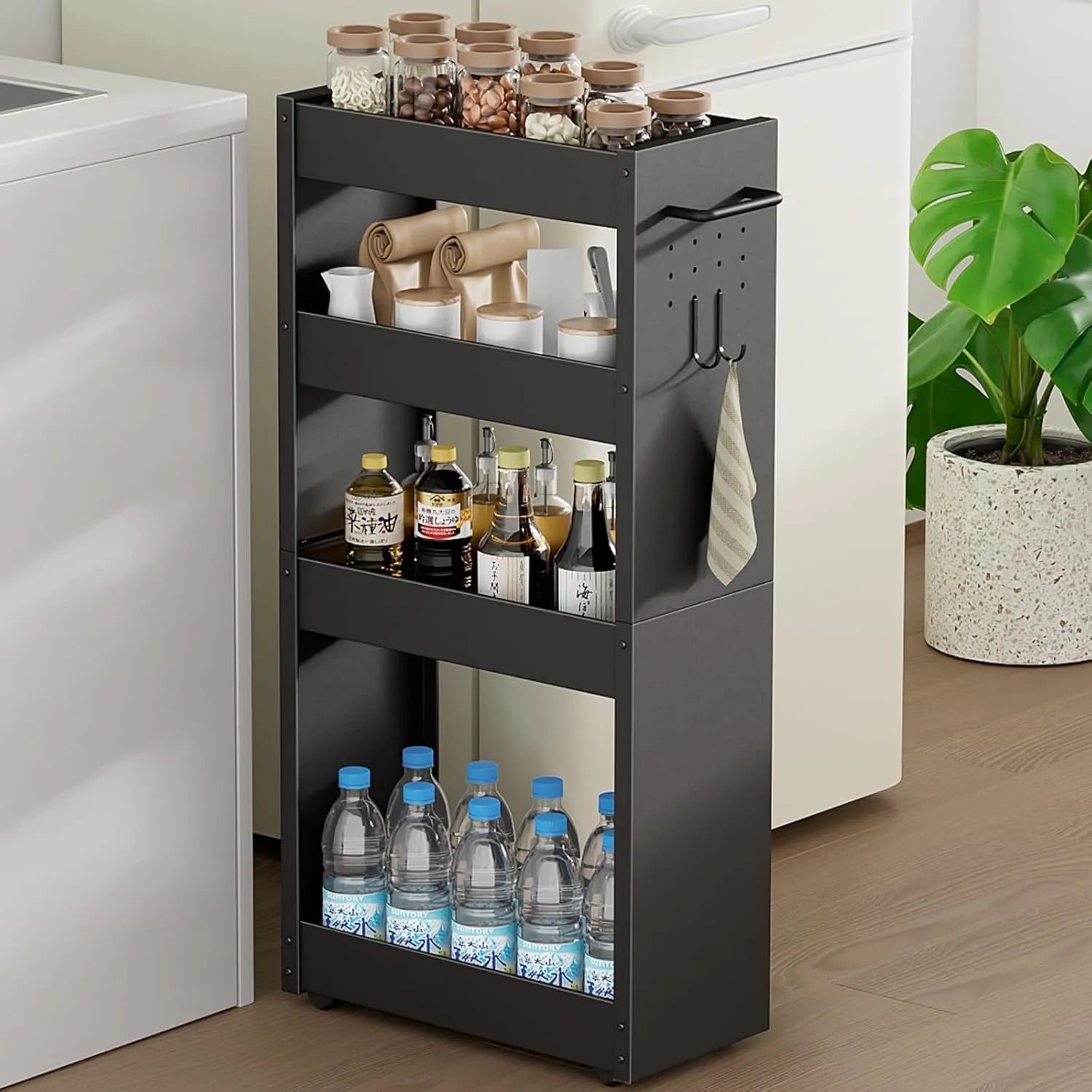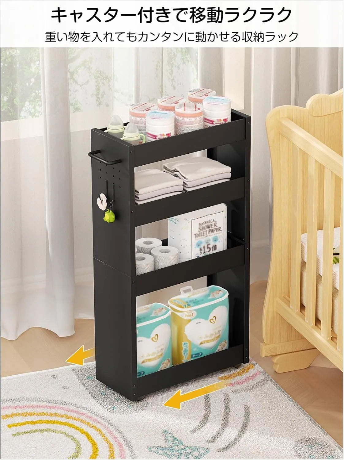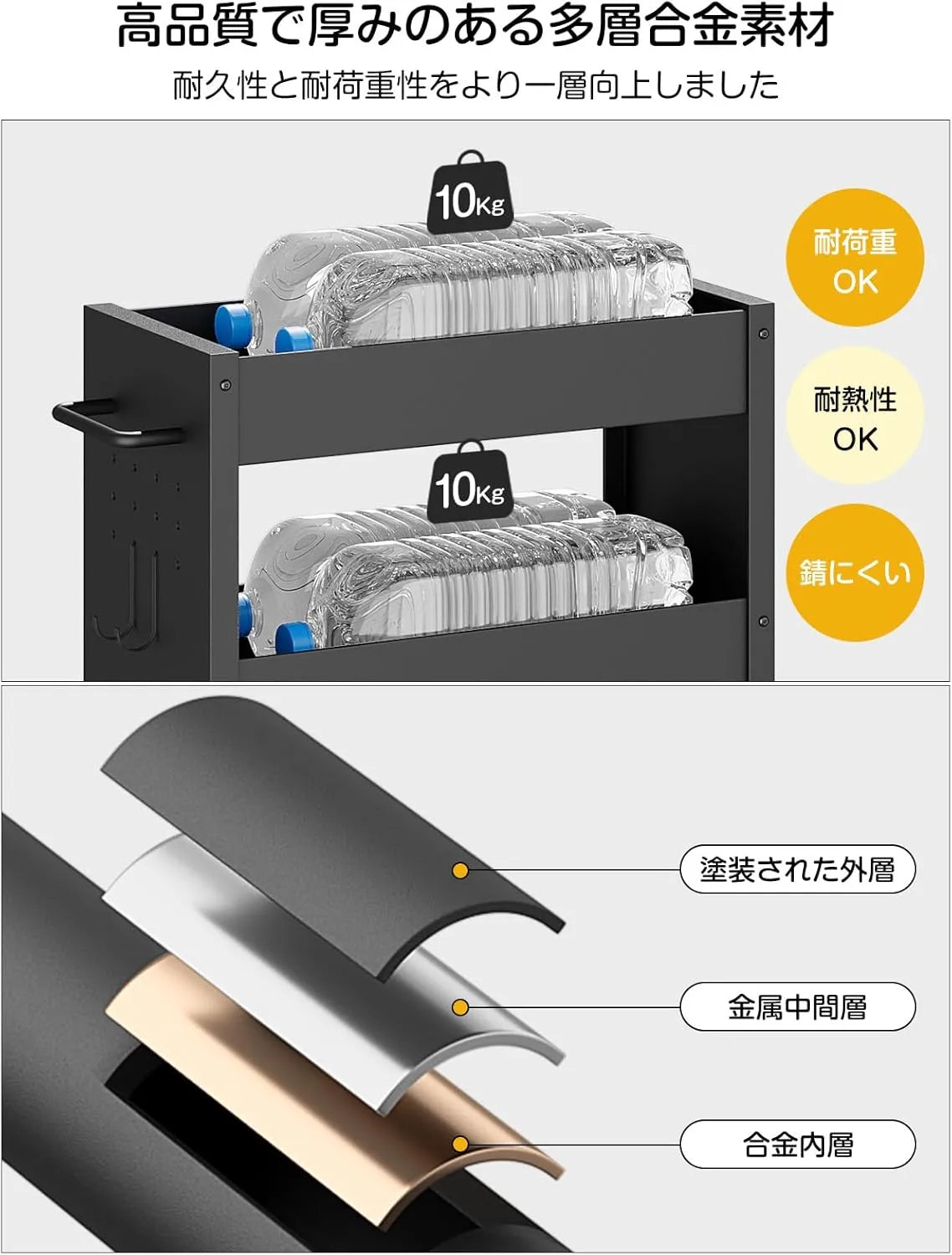 直進式固定キャスターを採用し、安定した移動が可能。ハンドル付きで奥の物も簡単に引き出せ、床を傷つける心配もありません。さらにキッチンツール掛けとして使えるフックを2個装備しています。