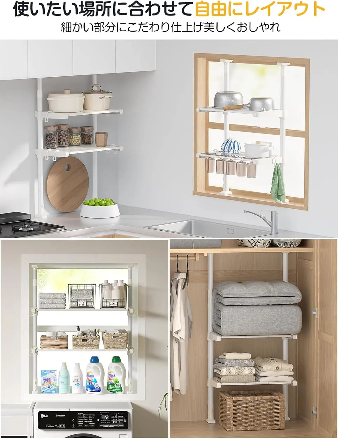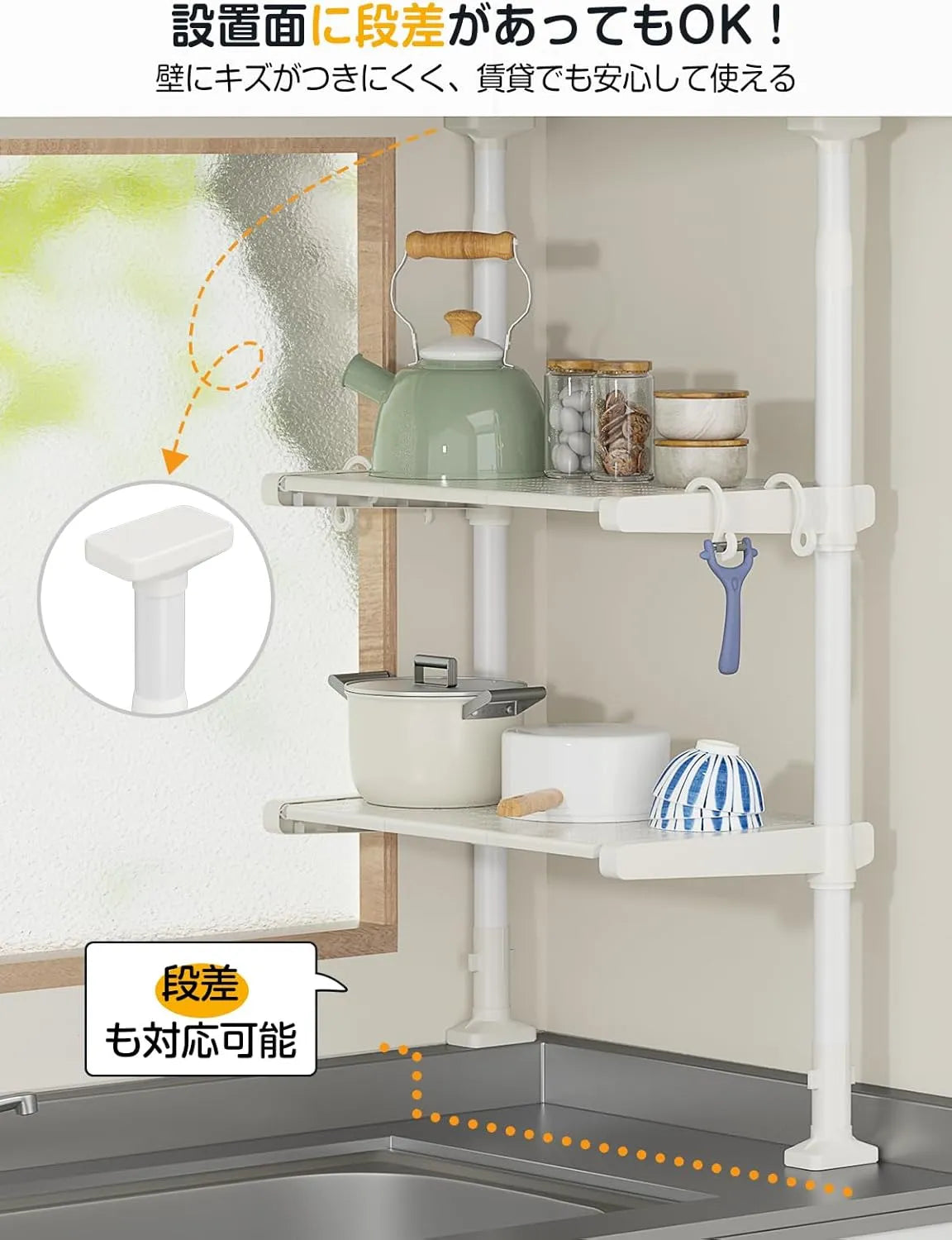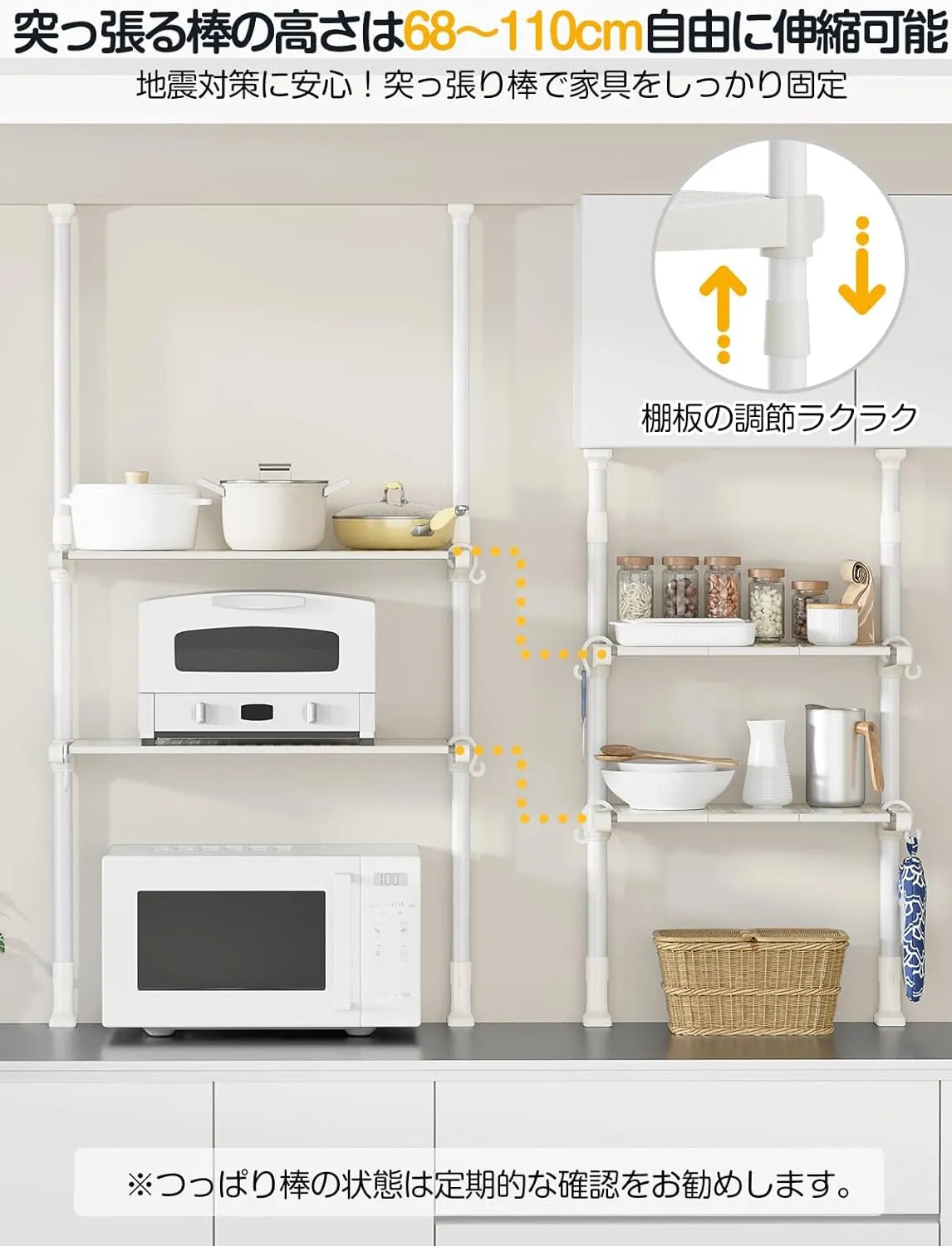 つっぱり棒の高さは68〜110cmで自由調整可能。左右の支柱が独立して高さ調整できるため、安定した設置が可能です。シンク上やコンロ周り、吊り戸棚下など、様々なキッチンスペースに柔軟に設置でき、無駄なく収納スペースを利用できます。