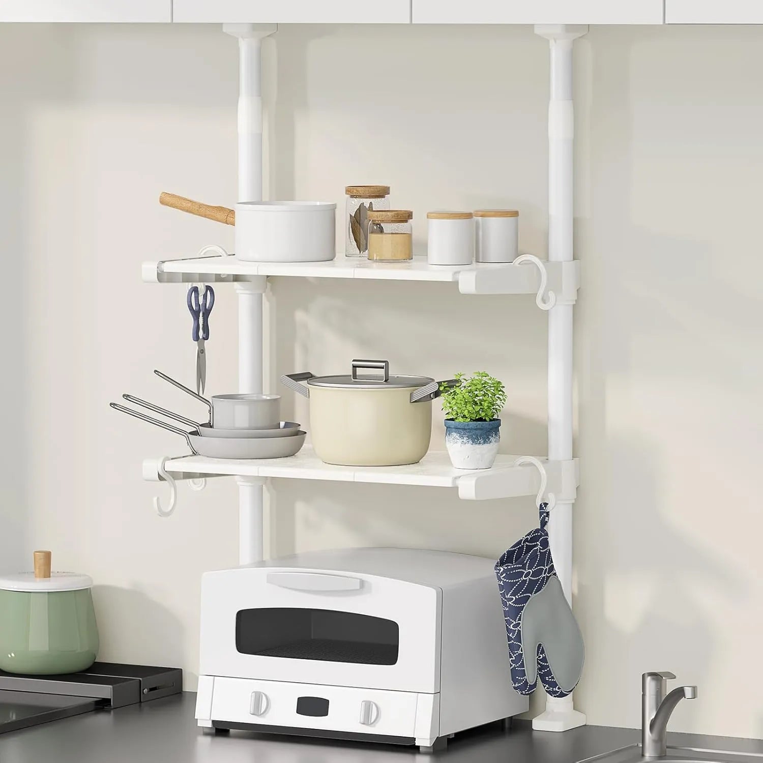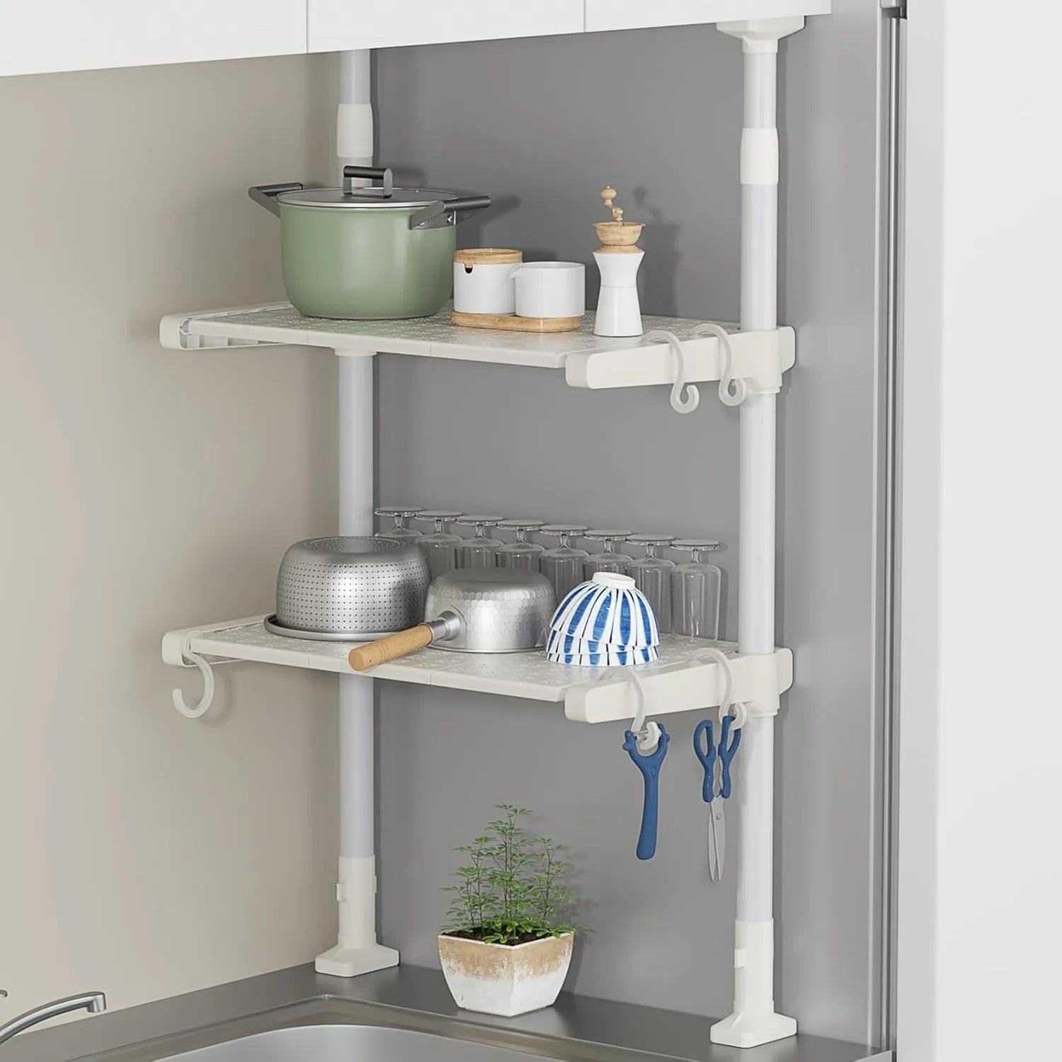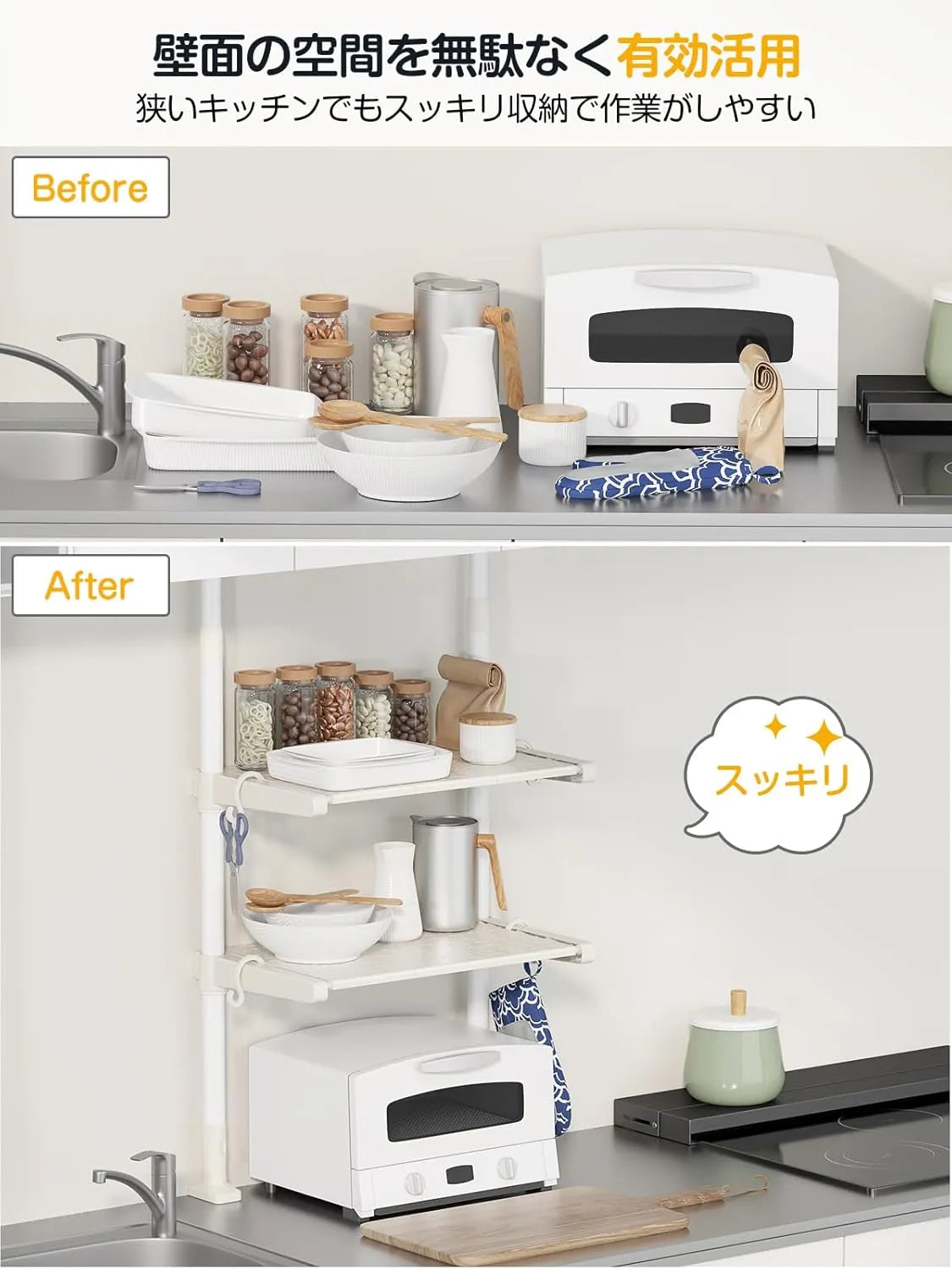 つっぱり棒の高さは68〜110cmで自由調整可能。左右の支柱が独立して高さ調整できるため、安定した設置が可能です。シンク上やコンロ周り、吊り戸棚下など、様々なキッチンスペースに柔軟に設置でき、無駄なく収納スペースを利用できます。