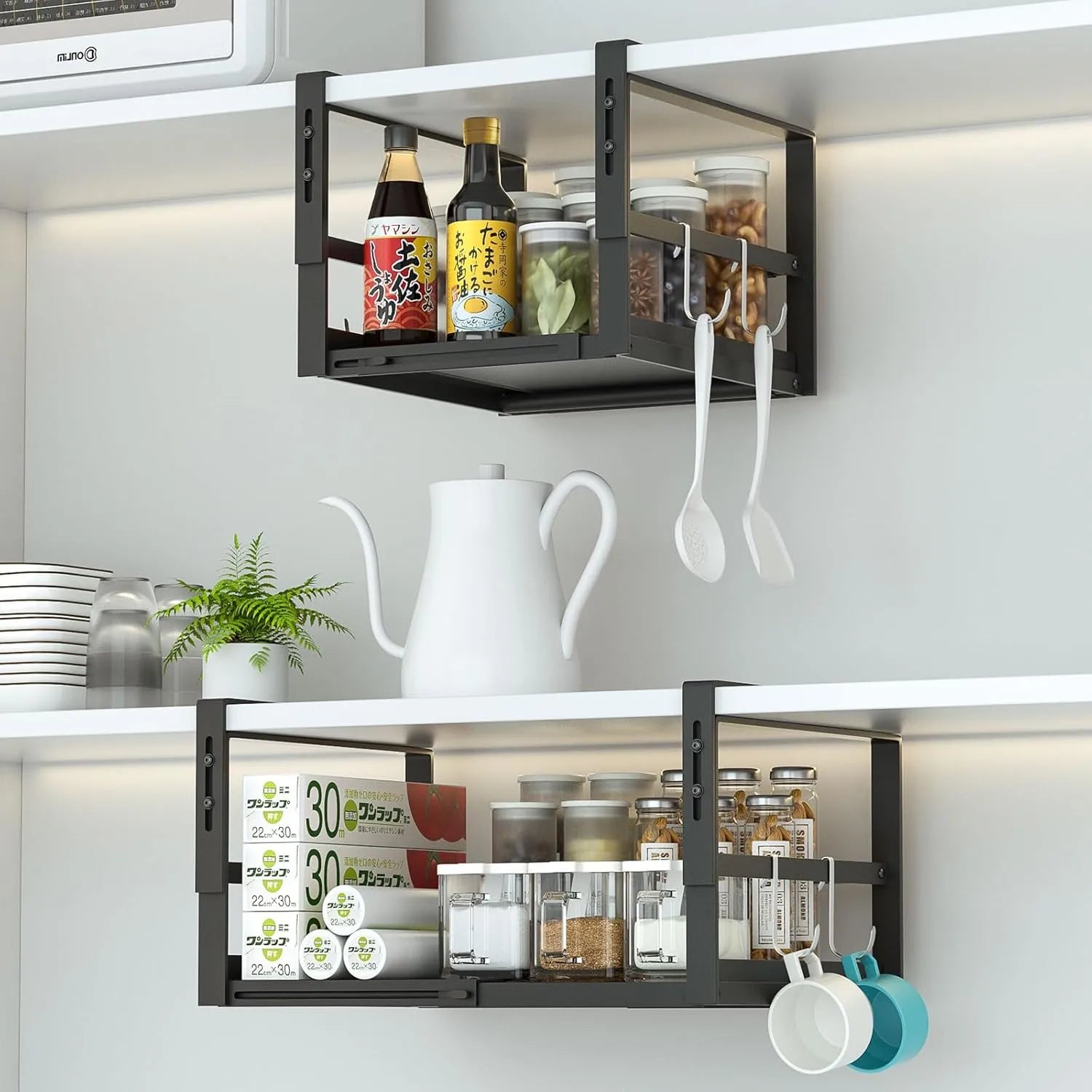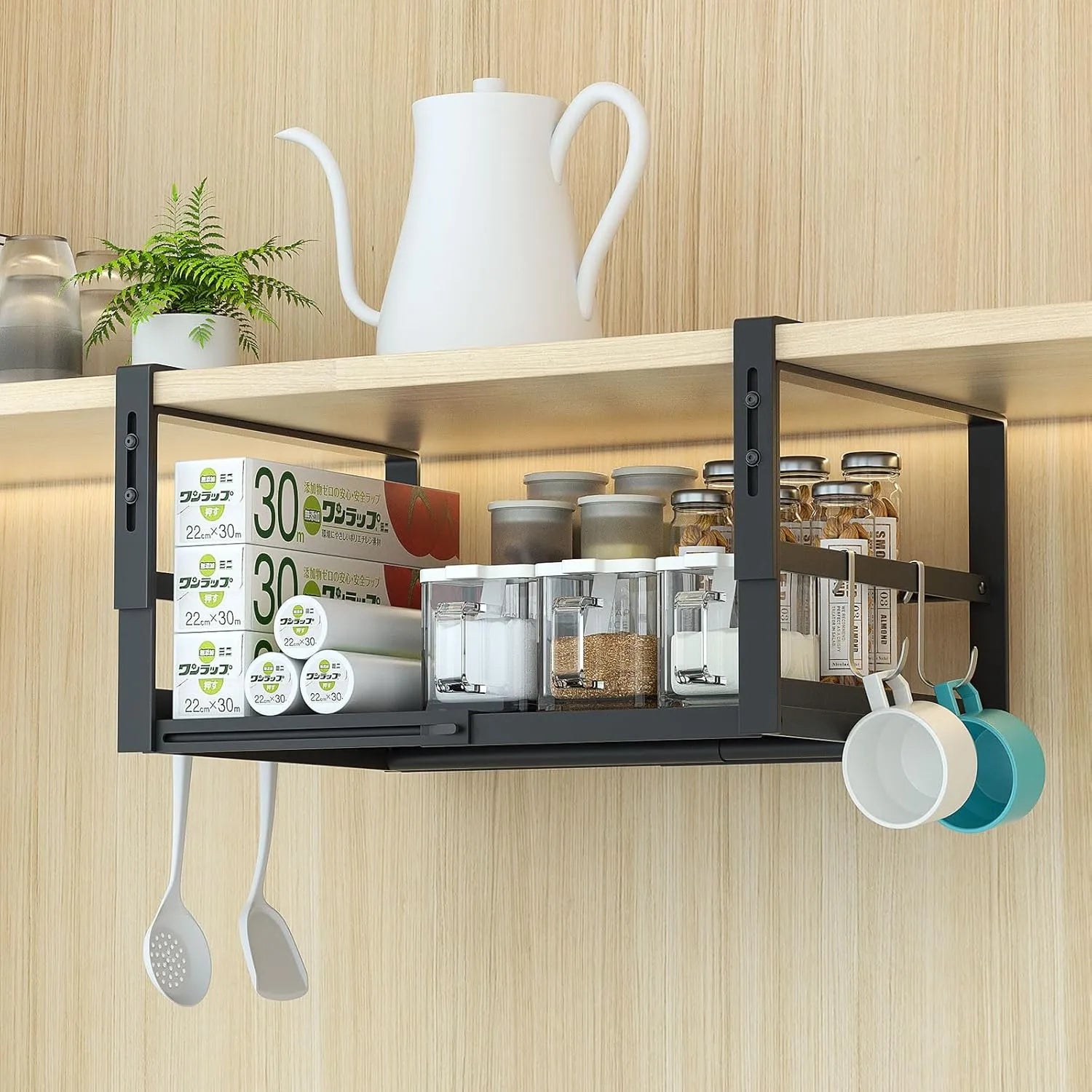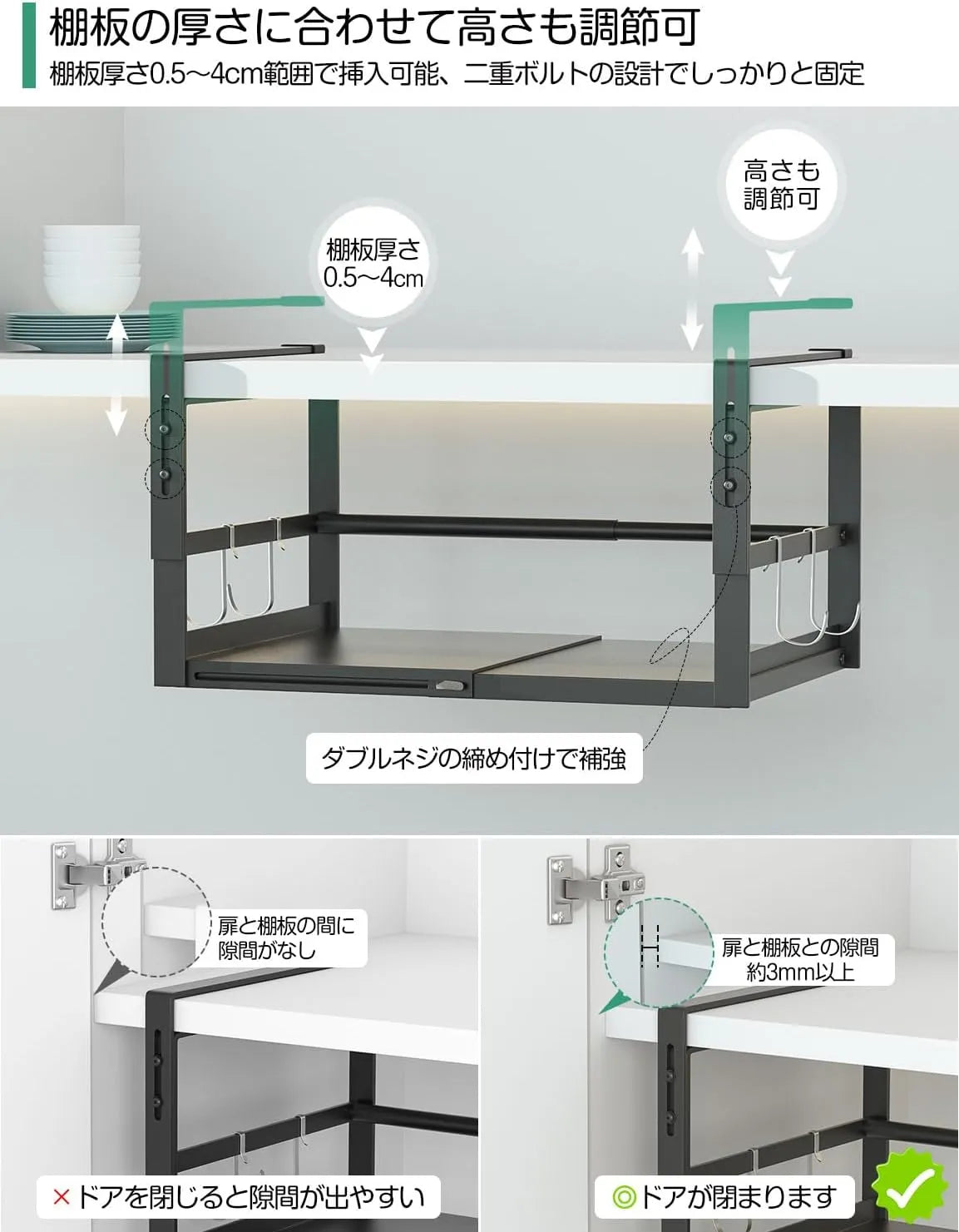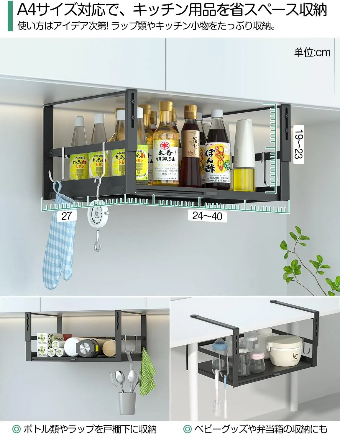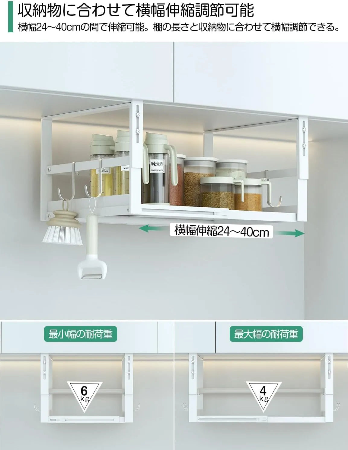 棚の隙間スペースを有効活用して調味料を収納し、キッチンをスッキリ片付けたい方に、この伸縮可能な吊り下げラックをおすすめします。